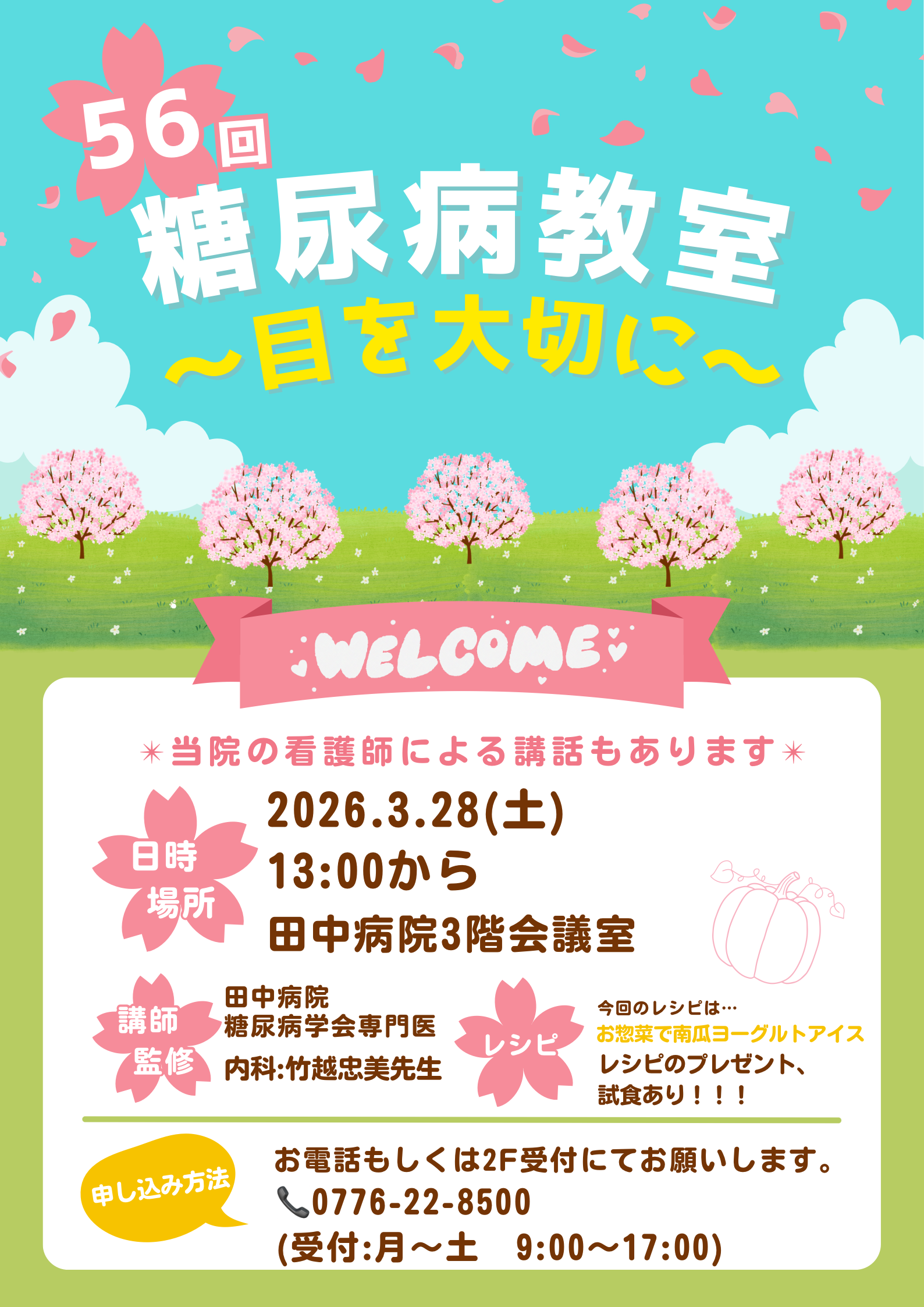 お知らせ NEWS TOP お知らせ 診療案内 内科 第56回市民健康教室(糖尿病教室)のご案内 お知らせ NEWS 病院からの大切なお知らせお知らせ診療案内内科大腸肛門外科看護部イベント看護だより 2026.02.26 お知らせ 内科 イベント 第56回市民健康教室(糖尿病教室)のご案内 2026年3月28日(土)13時より第56回市民健康教室(糖尿病教室)を開催します。 テーマ ~ 目を大切に ~ 講 師 田中病院 糖尿病学会専門医 竹越 忠美 先生 日 時 3月28日(土)13時00分~14時00分 場 所 3階 会議室(エレベータ前) 費 用 無料 低カロリーレシピプレゼント&試食会もございます。 皆さまお誘いあわせの上 ご自由にご参加ください!お電話での申込も可能です。当日参加・糖尿病以外の方もOK! PREV 一覧に戻る